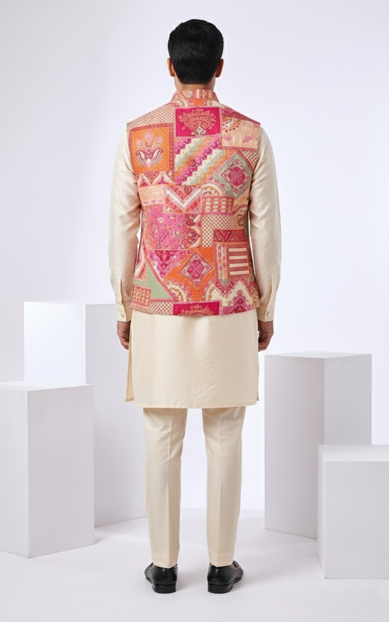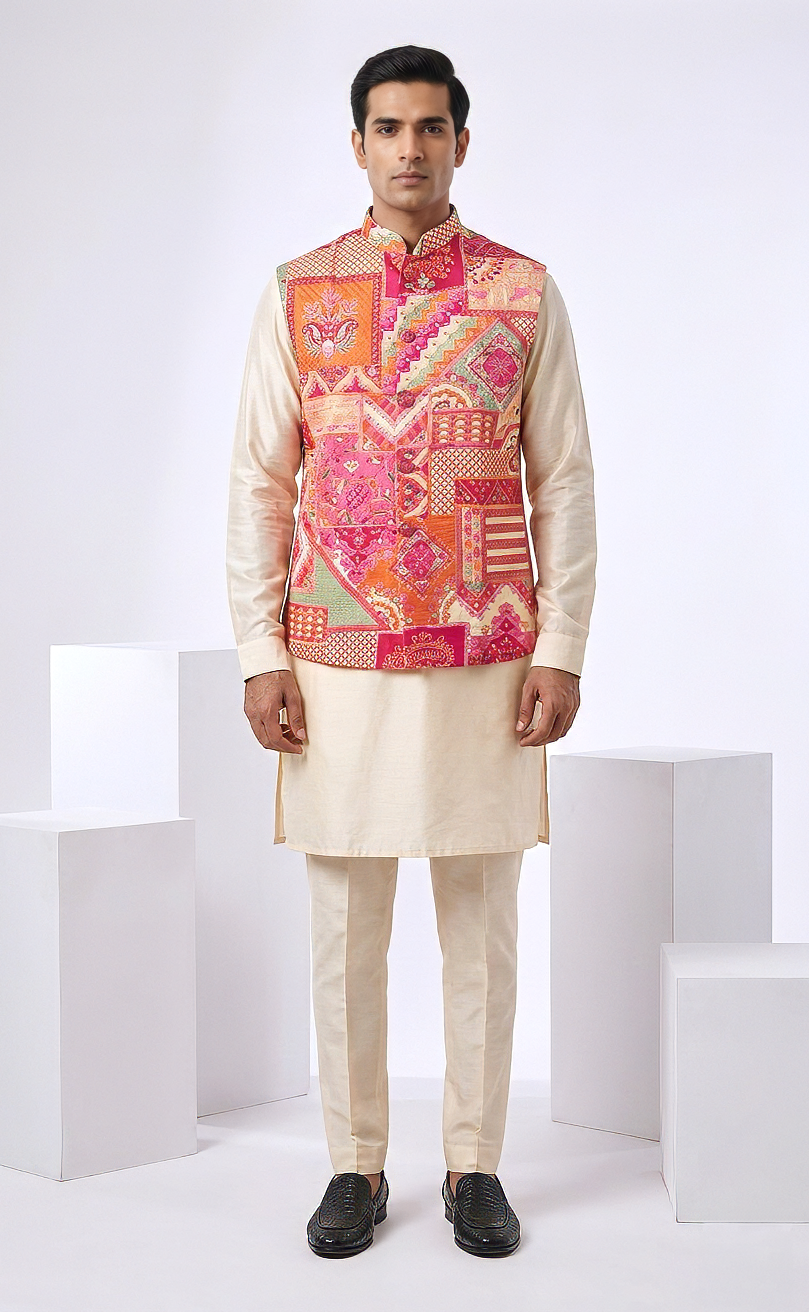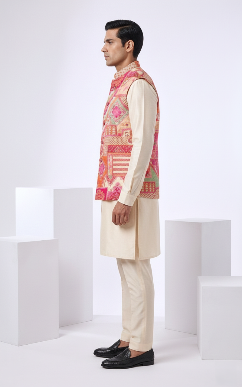multicolored printed bundi paired with a cream a off white kurta set kurta langth-35